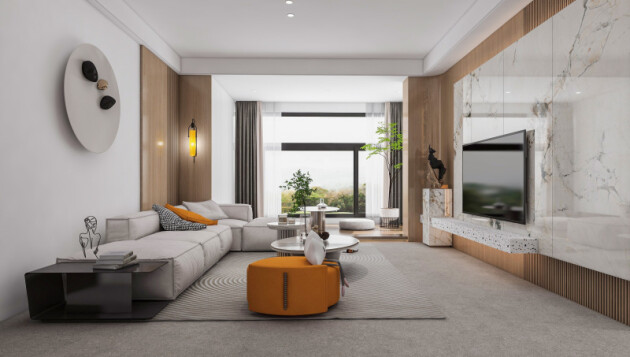 軟裝選用淺灰色L形沙發(fā),搭配淺灰圓形茶幾,極具幾何造型感,再用橘色的坐凳和抱枕做點綴,讓空間更有活力。