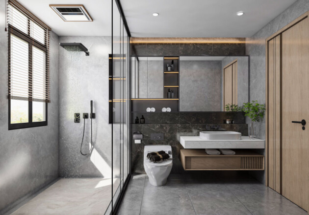 衛(wèi)浴間以灰色為主色調(diào),搭配黑色、原木色做點綴,帶來濃烈的現(xiàn)代時尚感,瞬間提升空間格調(diào)。