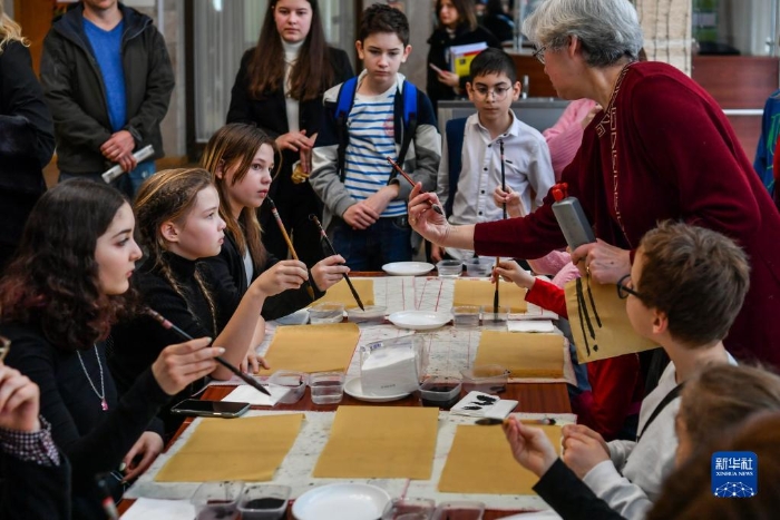 3月3日,中小學(xué)生們在俄羅斯莫斯科國際關(guān)系學(xué)院舉辦的“中國魅力”主題活動上學(xué)習(xí)使用毛筆。新華社記者 曹陽 攝