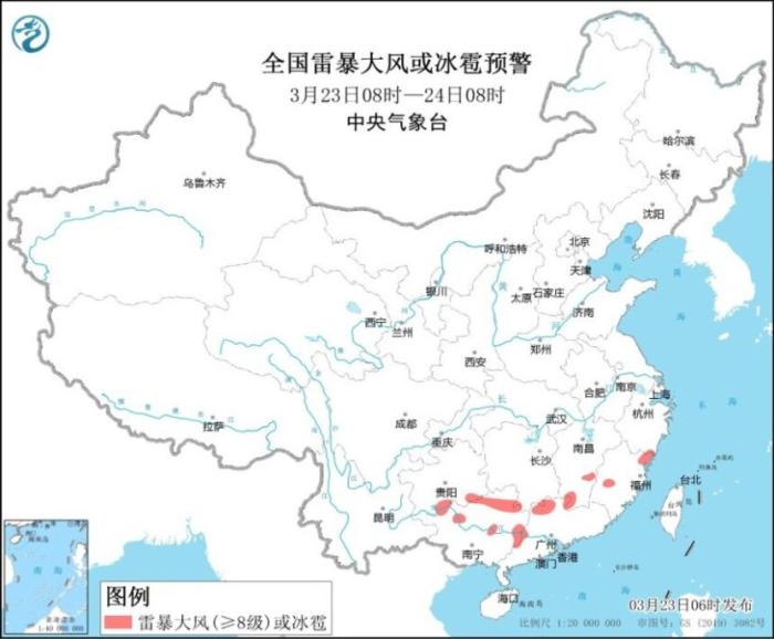 全國雷暴大風(fēng)或冰雹預(yù)警圖(3月23日08時(shí)-24日08時(shí))