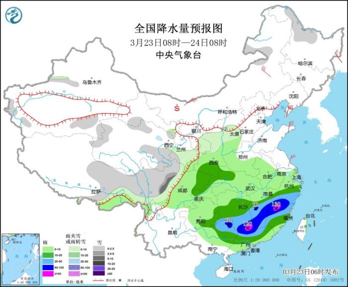 3月23日08時(shí)至24日08時(shí),內(nèi)蒙古東部、黑龍江西北部、西藏東部、青海東部、甘肅南部、川西高原、陜西北部、山西中部等地的部分地區(qū)有小到中雪或雨夾雪,局地有大雪。貴州東南部、湖南南部、江西中南部、浙江南部、福建西部和北部、廣西東北部、廣東北部等地的部分地區(qū)有大到暴雨,其中,廣東西北部、福建西北部等地局地有大暴雨(100~130毫米)。內(nèi)蒙古大部、遼東半島、山東半島等地的部分地區(qū)有4~6級(jí)風(fēng)。黃海大部海域?qū)⒂?~8級(jí)、陣風(fēng)9級(jí)的偏北到東北風(fēng)。
