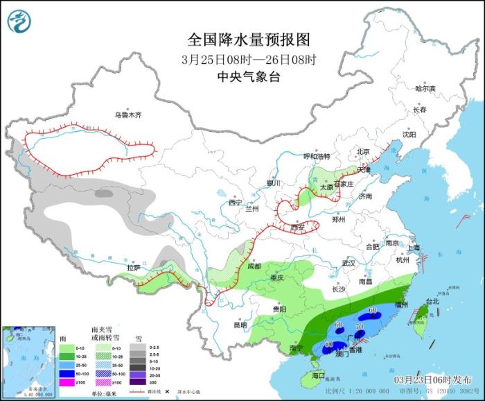 3月25日08時(shí)至26日08時(shí),新疆南疆高海拔山區(qū)、西藏北部和南部、青海西南部、山西中部、川西高原等地部分地區(qū)有小到中雪或雨夾雪。湖南南部、江西南部、福建大部、廣西東部、廣東大部等地部分地區(qū)有中到大雨,其中,江西南部、廣東中部和南部等地部分地區(qū)有暴雨(50~80毫米)。