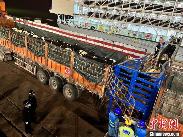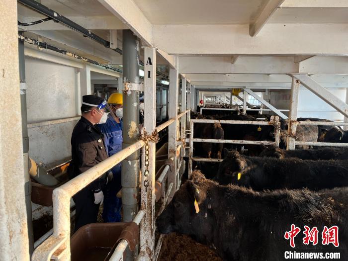 邊檢民警全程監(jiān)護(hù)活牛卸載入境。 廣西欽州保稅港區(qū)出入境邊防檢查站供圖