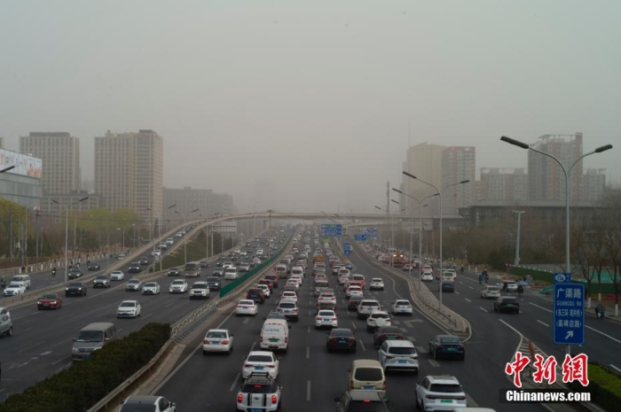 北京市氣象臺(tái)3月22日05時(shí)40分升級(jí)發(fā)布沙塵暴黃色預(yù)警信號(hào)。圖為當(dāng)日上班早高峰,北京市已出現(xiàn)明顯沙塵天氣。中新社記者 盛佳鵬 攝