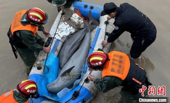 朱培洪赤腳翻下海塘,拉起橡皮艇,快速向兩頭江豚走去,眾人合力將兩頭江豚抱進(jìn)橡皮艇往岸邊拉去。到達(dá)岸邊后,救援人員利用工地的吊車(chē)將橡皮艇拉上海塘。