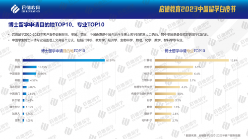 啟德留學(xué)2020-2022年客戶服務(wù)數(shù)據(jù)顯示,博士留學(xué)的申請量平均每年增長10-15%, 2022年相比2021年增長了21.8%;美國(61.97%)、英國(10.55%)、中國香港(10.06%)是中國內(nèi)地學(xué)生博士求學(xué)的三大目的地。博士留學(xué)學(xué)科分布中,理工科占比超過5成,前十大申請專業(yè)分別是計算機(jī)(12.6%)、教育學(xué)(6.5%)、經(jīng)濟(jì)學(xué)(6.4%)、生物科學(xué)(5.7%)、物理學(xué)與天文學(xué)(4.3%)、傳播學(xué)與媒體研究(3.6%)、化學(xué)(3.2%)、數(shù)學(xué)(3%)、語言學(xué)(2.8%)、材料科學(xué)(2.7%)。