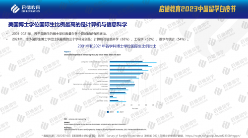 《美國博士學(xué)位調(diào)查》發(fā)布的2021年博士學(xué)生統(tǒng)計數(shù)據(jù)顯示,中國是赴美就讀博士的第一大生源國,2011年至2021年,在授予學(xué)生簽證持有者的181446個博士學(xué)位中,來自中國的學(xué)生(59430)占比接近1/3 。2021年,授予國際生博士學(xué)位比例最高的三個學(xué)科分別是:計算機(jī)與信息科學(xué)(65%)、工程學(xué)(58%)、數(shù)學(xué)與統(tǒng)計(54%),并且自2001年以來,國際生比例增加最大的均出現(xiàn)在計算機(jī)與信息科學(xué)、數(shù)學(xué)與統(tǒng)計領(lǐng)域。