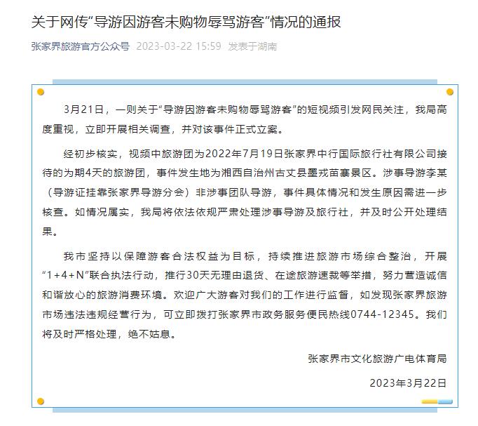 張家界市文化旅游廣電體育局表示,如情況屬實(shí),將依法依規(guī)嚴(yán)肅處理涉事導(dǎo)游及旅行社,并及時(shí)公開處理結(jié)果。