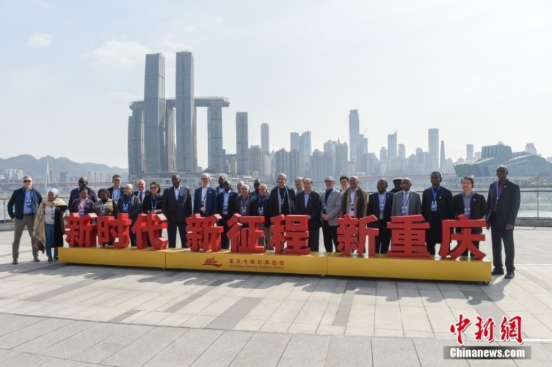 3月20日至22日,來自歐洲、非洲、亞洲的26個國家和地區(qū)的駐華使節(jié)代表團赴重慶參訪,重點考察成渝地區(qū)雙城經(jīng)濟圈和西部陸海新通道建設(shè)等情況。圖為3月20日,駐華使節(jié)代表團在重慶市規(guī)劃展覽館外合影留念。中新社記者 何蓬磊 攝