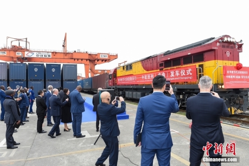 3月21日,駐華使節(jié)代表團在重慶鐵路集裝箱中心站,見證中歐班列(成渝)發(fā)車。中新社記者 何蓬磊 攝