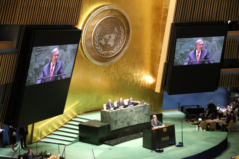 3月22日,在位于紐約的聯(lián)合國總部,聯(lián)合國秘書長古特雷斯在聯(lián)合國2023年水事會(huì)議上致開幕辭。新華社記者謝鍔攝