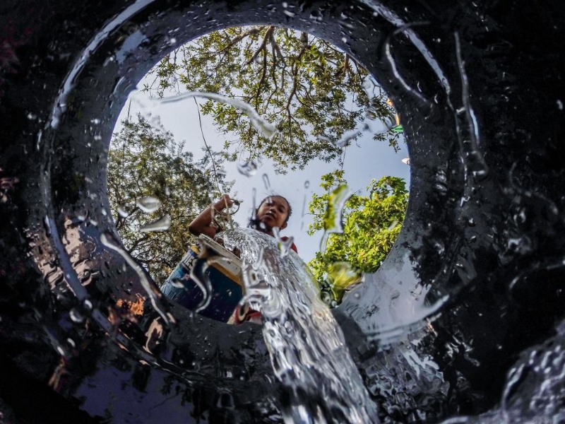 3月22日,在菲律賓奎松市的一處水井附近,居民將水倒入桶里。新華社發(fā)(烏馬利攝)