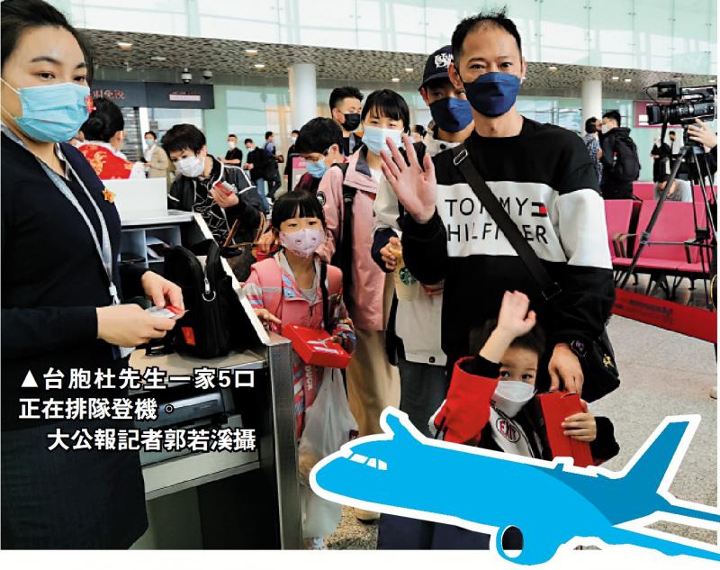 圖:臺胞杜先生一家5口正在排隊登機。\香港《大公報》記者郭若溪攝