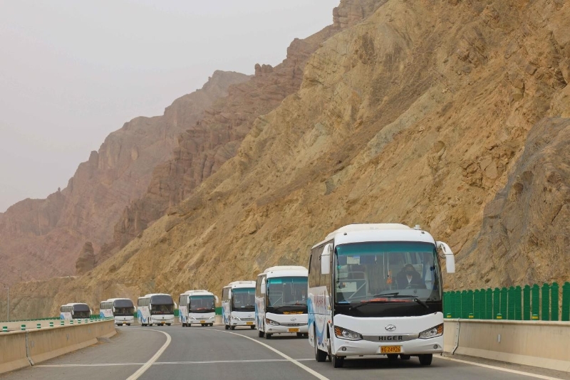其次,高端車輛的保障則是最大硬實力。大西北的旅游景點之間有些要隔著一兩百公里,為了讓乘客旅行途中更舒適、更安全,號角兵魂在選擇車輛時格外用心,其選車的標準安全性排在首位,這也是號角兵魂選擇蘇州金龍海格客車最主要的原因之一。海格客車全承載式車身、車道偏離系統(tǒng)、前碰撞預警等安全設計和配置全面保障了人車安全;除此以外,車輛的舒適度也很重要,為了讓游客旅行途中更好休息,號角兵魂在之前車輛2+2座椅布局的基礎上新采購了海格客車2+1座椅布局的新車型,座位的空間變大了,每個座椅還設計有杯托、手機充電口,腿托等人性化配置,能很大程度上緩解疲勞。以海格途悅2+1車型為代表,高端商務旅游大巴車型開始被旅行社和游客頻繁“點單”;在定制化方面,隨著游客的需求越來越多樣化,人數(shù)較多的大團適合大行李艙、多座位數(shù)的車型,深度游或路程較遠的旅游團就適合2+1座椅的商務大巴,而家庭出行的小團游則適合機動靈活的蘇州金龍睿星這類車型。總之,在車輛上要形成產(chǎn)品組合,這樣才能滿足不同類型的游客需要,在旅游客運服務競爭中也會有更強的競爭力。