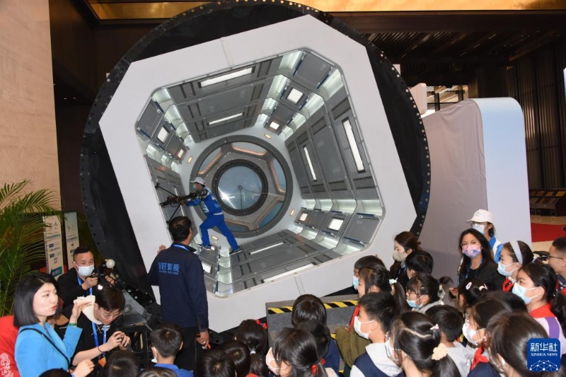 3月27日,小學(xué)生在觀看“流浪地球”太空艙演示項(xiàng)目。