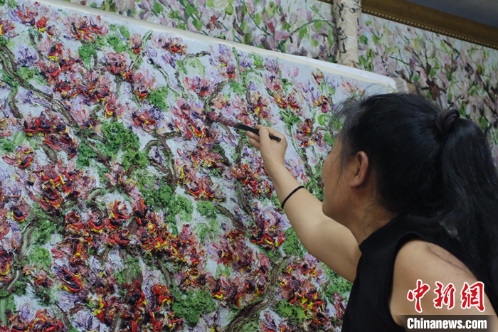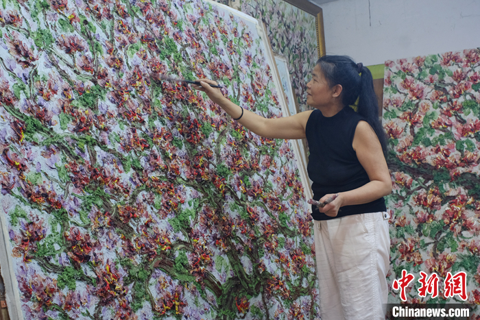 圖為3月22日,廣西柳州,林建莉的工作室內(nèi),她正站在椅子上,用畫筆肆意描繪著一幅巨型的洋紫荊油畫。 中新社記者 劉俊聰 攝