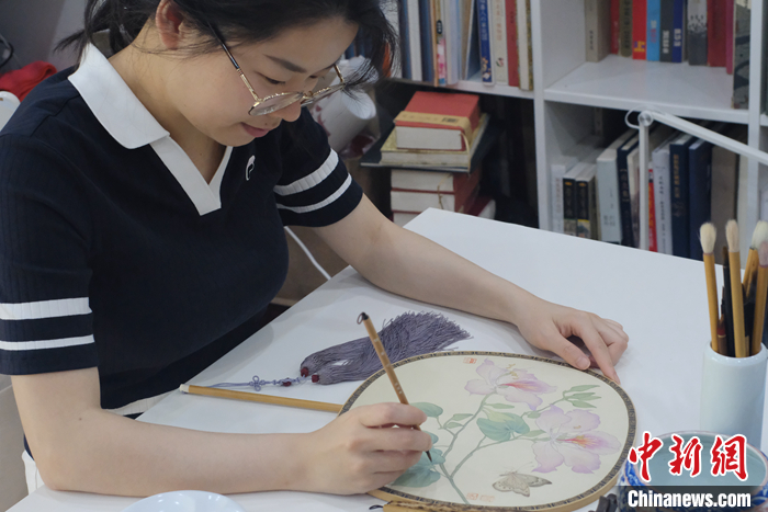圖為3月22日,廣西柳州,林建莉的兒媳婦何媛將精致古典的工筆畫繪制在團扇上,這些洋紫荊團扇被作為高端禮品銷往美國、英國、意大利等國家。林建莉和其家人不斷創(chuàng)新藝術(shù)形式,將柳州的洋紫荊文化推向世界。 中新社記者 劉俊聰 攝