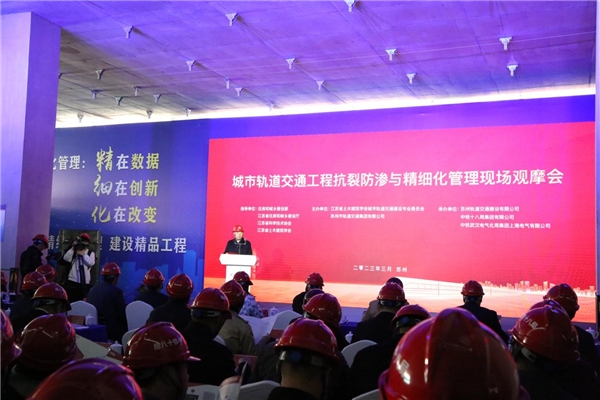 觀摩現(xiàn)場(chǎng)重點(diǎn)展示了城市軌道交通工程精細(xì)化管理、機(jī)電工藝、裝飾裝修工藝、抗裂防滲技術(shù)等智慧化手段和先進(jìn)工藝。觀摩會(huì)上,江蘇省土木建筑學(xué)會(huì)城軌專委會(huì)主任張大春、蘇州市軌道交通集團(tuán)有限公司董事長(zhǎng)金銘致辭;中國(guó)工程院院士、東南大學(xué)教授劉加平現(xiàn)場(chǎng)作題為《地鐵混凝土抗裂防滲關(guān)鍵技術(shù)與應(yīng)用》報(bào)告;住房和城鄉(xiāng)建設(shè)部質(zhì)安司二級(jí)巡視員張紅梅、江蘇省住房和城鄉(xiāng)建設(shè)廳質(zhì)安處處長(zhǎng)蔣惠明發(fā)表講話。