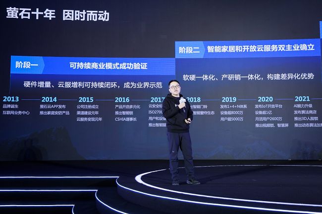 螢石國(guó)內(nèi)營(yíng)銷中心總經(jīng)理郭航標(biāo)上臺(tái)發(fā)表主題演講,他表示,自2013年螢石品牌發(fā)布至今,已經(jīng)走過(guò)了第一個(gè)10年,經(jīng)過(guò)十年的技術(shù)沉淀和市場(chǎng)發(fā)展,螢石構(gòu)建了“智能家居+物聯(lián)網(wǎng)云平臺(tái)”的雙主業(yè),成長(zhǎng)為了一家軟件硬件一體化和產(chǎn)研銷一體化的AIoT公司。