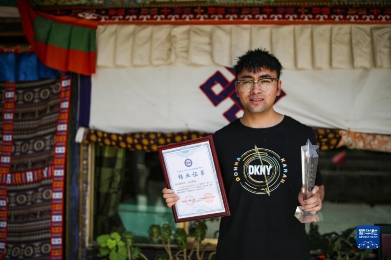 “格?;ㄩ_(kāi)”大學(xué)生就業(yè)創(chuàng)業(yè)特訓(xùn)營(yíng)學(xué)員、江蘇今世緣酒業(yè)股份有限公司甘青藏大區(qū)業(yè)務(wù)經(jīng)理土旦平措展示特訓(xùn)營(yíng)結(jié)業(yè)證書(shū)和“區(qū)外就業(yè)之星”獎(jiǎng)杯(2022年6月23日攝)。新華社記者 姜帆 攝