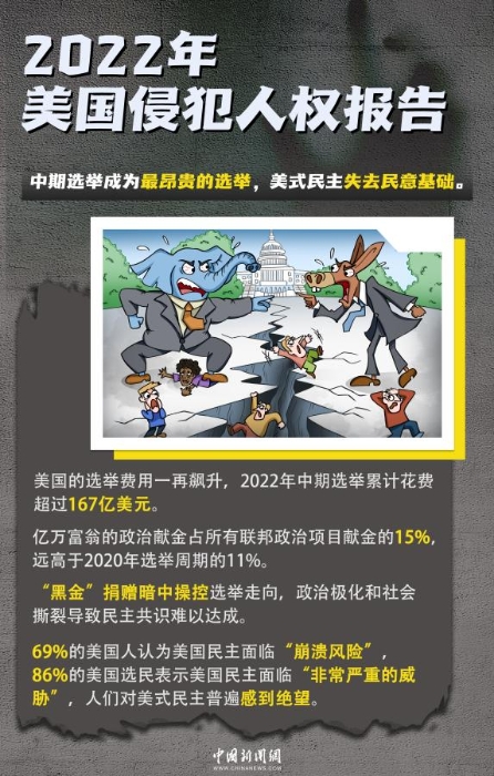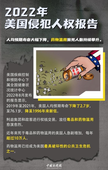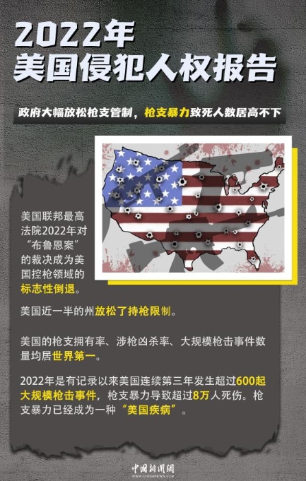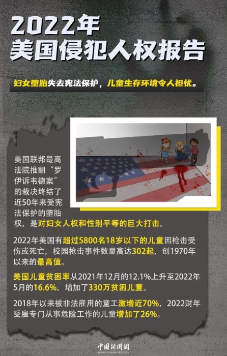 2022年,美國政府放松持槍限制,致使美國涉槍兇殺率、大規(guī)模槍擊事件數(shù)量高居全球第一;大搞政治獻(xiàn)金,“黑金”捐贈(zèng)暗中操控選舉走向,大喊民主口號(hào)的選舉,實(shí)則失去了真實(shí)的民意基礎(chǔ);加劇種族對立,少數(shù)族裔遭受歧視日益嚴(yán)重,基于種族偏見的仇恨犯罪大幅增長;放縱權(quán)錢交易,為了蠅頭小利任由毒品禍亂四方,導(dǎo)致死于毒品和藥物濫用的美國人急劇增加;終結(jié)近50年來受憲法保護(hù)的婦女墮胎權(quán),不僅是對婦女權(quán)利和性別平等的置若罔聞,也是對兒童權(quán)益的深重打擊;亂揮制裁大棒,穩(wěn)坐單邊制裁的“世界之最”,對被制裁國家毫不留情,對當(dāng)?shù)孛癖娚钅魂P(guān)心;濫用軍事力量,在85個(gè)國家和地區(qū)開展軍事行動(dòng),導(dǎo)致近百萬無辜平民死亡……