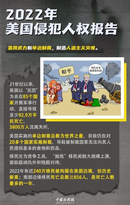 中新網(wǎng)北京3月29日電 (王續(xù)燃)近日,《2022年美國侵犯人權(quán)報(bào)告》正式發(fā)布,報(bào)告以七部分近兩萬字的詳實(shí)數(shù)據(jù)和內(nèi)容,揭開了美國披著“人權(quán)衛(wèi)士”、“人權(quán)燈塔”的羊皮,實(shí)際卻大行特行人權(quán)侵犯之實(shí)的真相。