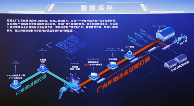智能庫存——打通工廠和零部件供應商訂單系統(tǒng),利用二維碼技術,為每一個零部件賦予唯一的身份序列號,實現(xiàn)對每個零部件全生命周期信息可追溯。打通廠內外零部件物流,基于智能物流算法,分析得出最優(yōu)零部件生產量和物流及存儲方案,零部件直配廠家RDC庫,甚至直配產線,取消VMI周轉庫,極大降低零部件庫存的同時滿足零部件交付0延誤。