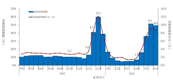 根據(jù)中疾控最新發(fā)布的流感樣病例數(shù)據(jù),目前國內(nèi)流感雖有下坡趨勢,但仍處于大流行階段。最近一周哨點(diǎn)醫(yī)院報(bào)告的流感樣病例數(shù)仍在40萬以上,其中流感病毒陽性率達(dá)53.5%。