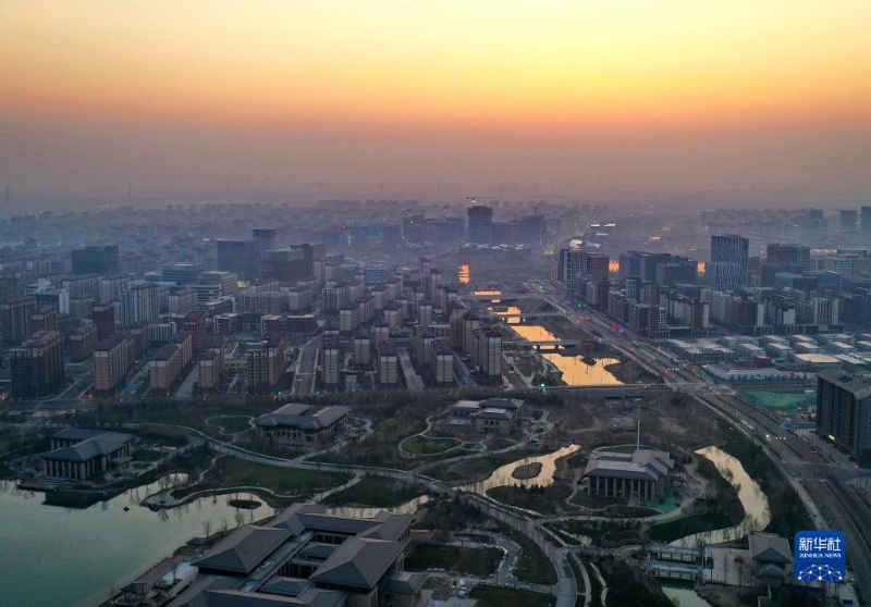 雄安新區(qū)容東片區(qū)內的水系沐浴在晨光中(2023年3月31日攝,無人機照片)。新華社記者 牟宇 攝