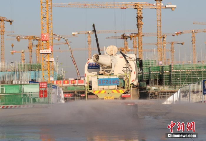 4月1日,是雄安新區(qū)設立六周年。圖為3月27日雄安新區(qū)一處安置房項目建設現(xiàn)場,灑水車在進行降塵作業(yè)。中新社記者 賈天勇 攝