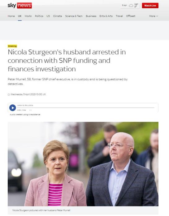 中新網(wǎng)4月5日電 據(jù)英國廣播公司(BBC)報道,英國蘇格蘭政府前首席大臣妮古拉·斯特金的丈夫因與蘇格蘭民族黨財政調(diào)查有關(guān)而被捕。