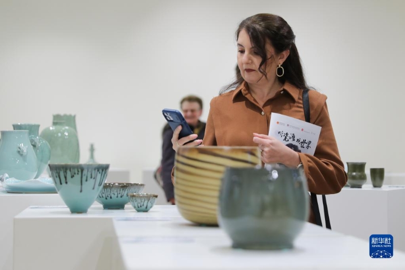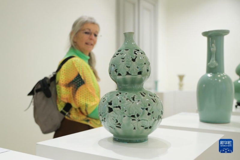 4月3日,在比利時(shí)布魯塞爾,參觀者在“聽瓷語 觀世界——宋韻龍泉青瓷展”上觀賞瓷器。