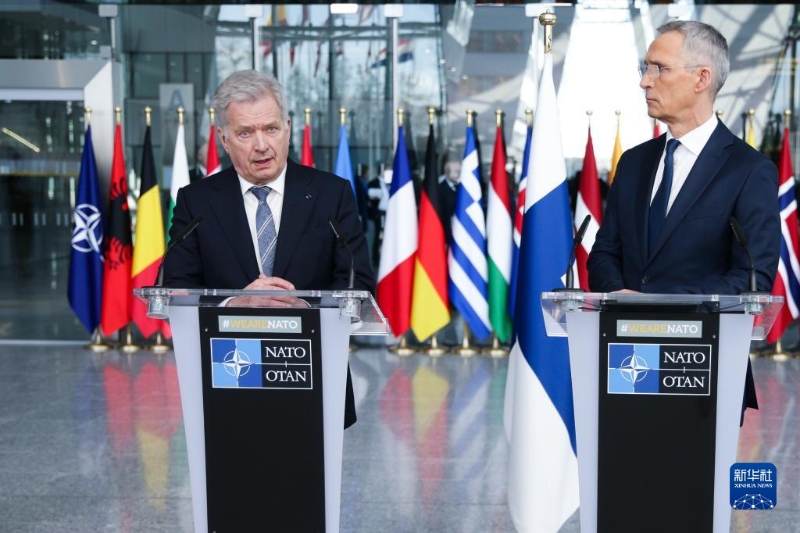 4月4日,在比利時布魯塞爾的北約總部,芬蘭總統(tǒng)尼尼斯托(左)和北約秘書長斯托爾滕貝格對媒體發(fā)言。