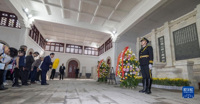 馬英九來到享堂內(nèi),帶領(lǐng)隨行人員向靈位行三鞠躬禮,并敬獻花圈、花籃?;ɑ@緞帶上書:“抗戰(zhàn)英烈浩氣長存”。