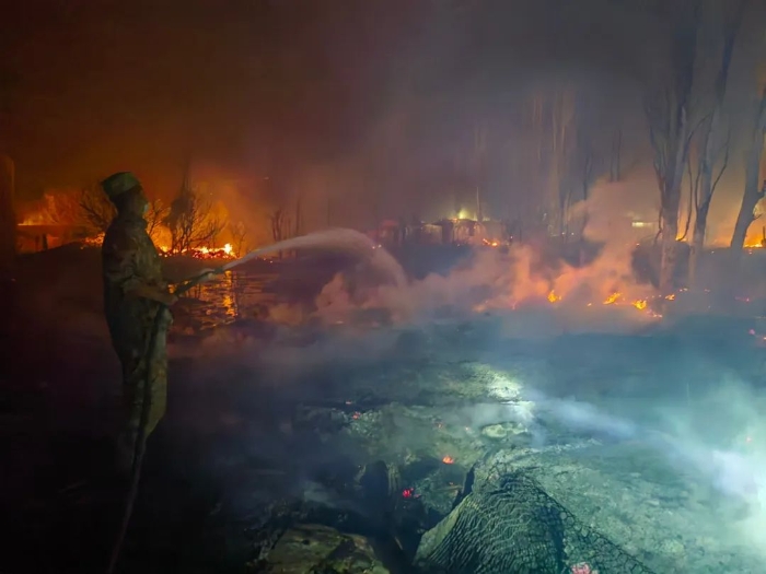 情況萬分緊急,指揮員冷靜分析著火點(diǎn)、風(fēng)向和村落布局后,冒著嗆鼻煙塵和滾燙熱氣投入滅火戰(zhàn)斗。一邊下令疏散群眾,一邊使用風(fēng)力滅火器、架設(shè)高壓水槍,正面搏擊“火魔”。