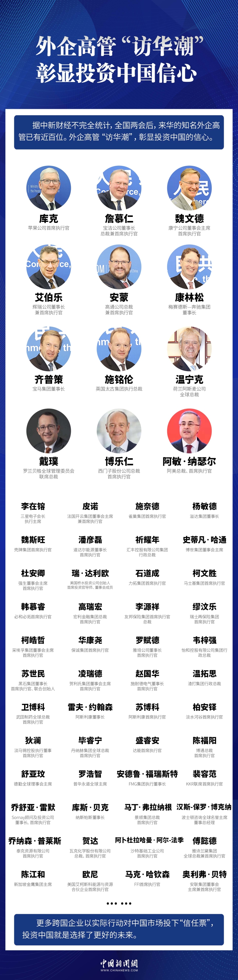 時下,外企高管正掀起“訪華潮”。據中新財經不完全統計,全國兩會后,來華的知名外企高管已有近百位。