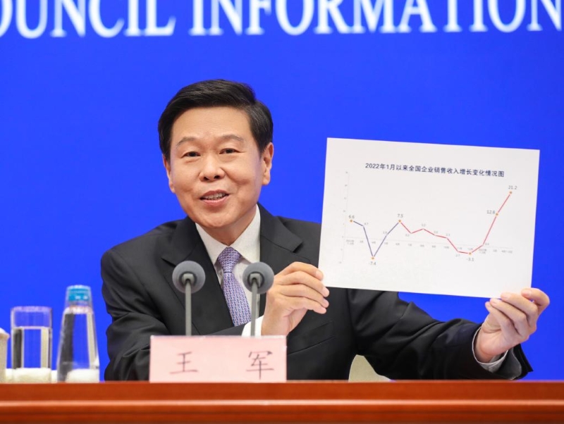 發(fā)布會(huì)上,王軍拿出一張圖,現(xiàn)場(chǎng)展示了2022年1月至2023年4月5日全國企業(yè)銷售收入增長變化情況。