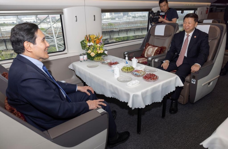 3月31日下午,中共中央臺辦、國務(wù)院臺辦主任宋濤(右)與馬英九先生(左)同乘高鐵從武漢赴長沙。新華社記者 才揚(yáng) 攝