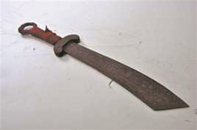 在中央蘇區(qū)反“圍剿”戰(zhàn)爭(zhēng)紀(jì)念館,陳列著一把紅5軍團(tuán)曾使用過(guò)的大刀。這把銹跡斑斑的大刀長(zhǎng)60厘米、重2公斤,刀柄末端有個(gè)圓環(huán),又叫環(huán)首大刀。