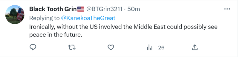 一名自我介紹是美國(guó)退役軍人的網(wǎng)友“現(xiàn)身說法”:“真諷刺,沒有美國(guó)摻和,中東或許未來就會(huì)實(shí)現(xiàn)和平。”