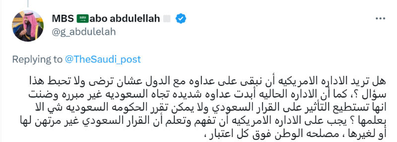 沙特網(wǎng)友阿博·阿卜杜勒拉言辭激烈地批評(píng):“只有我們與其他國(guó)家保持?jǐn)骋饷绹?guó)才不會(huì)失望嗎?美國(guó)政府對(duì)沙特表現(xiàn)出強(qiáng)烈而無理的敵意,居然還認(rèn)為它可以影響沙特的決定、沙特只能在它的指導(dǎo)下做事?美國(guó)政府必須了解,沙特的決定不依附于任何其他人。祖國(guó)的利益高于一切。”