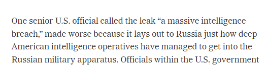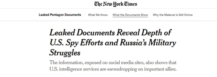 美國《紐約時報》近日接連報道,推特等多家社交媒體近來出現(xiàn)一批疑似美軍秘密文件,涉及俄烏沖突中烏克蘭方面兵力及武器配置、戰(zhàn)場地圖、俄烏雙方傷亡情況等情報,甚至包括標(biāo)有“絕密”的情報。