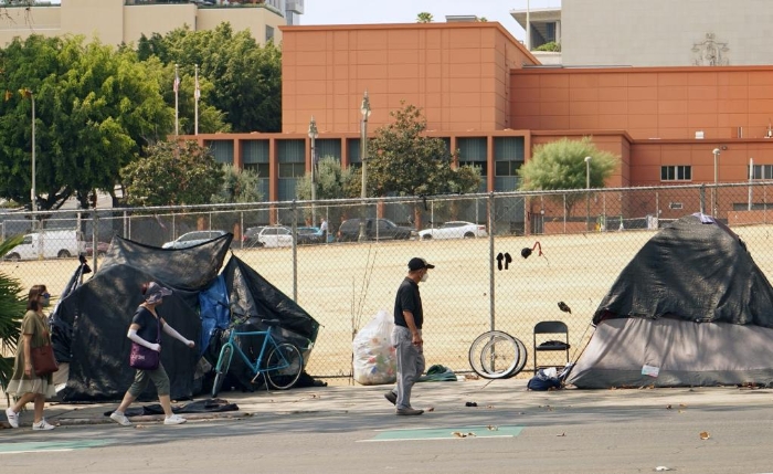 2022年9月8日,人們?cè)诿绹?guó)加利福尼亞州洛杉磯市區(qū)經(jīng)過(guò)無(wú)家可歸者的帳篷。新華社發(fā)(曾慧攝)
