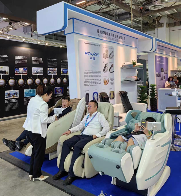 展會上,觀眾體驗福建榮耀健康科技股份有限公司帶來的家居按摩椅、商用智能按摩椅、按摩沙發(fā)等產品。(企業(yè)供圖)