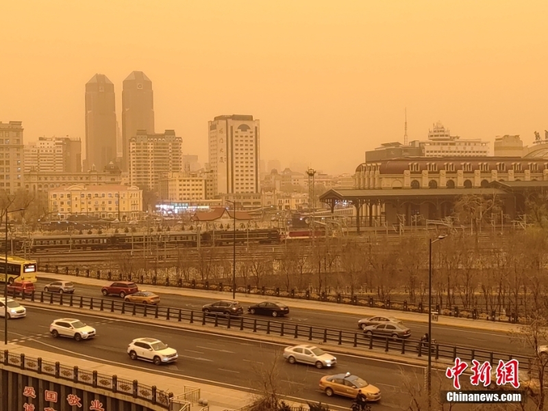 4月10日,哈爾濱哈爾濱市出現(xiàn)大風(fēng)揚(yáng)沙天氣,天空昏黃,能見度低。圖/視覺中國