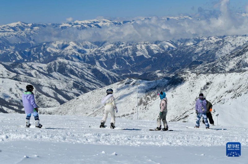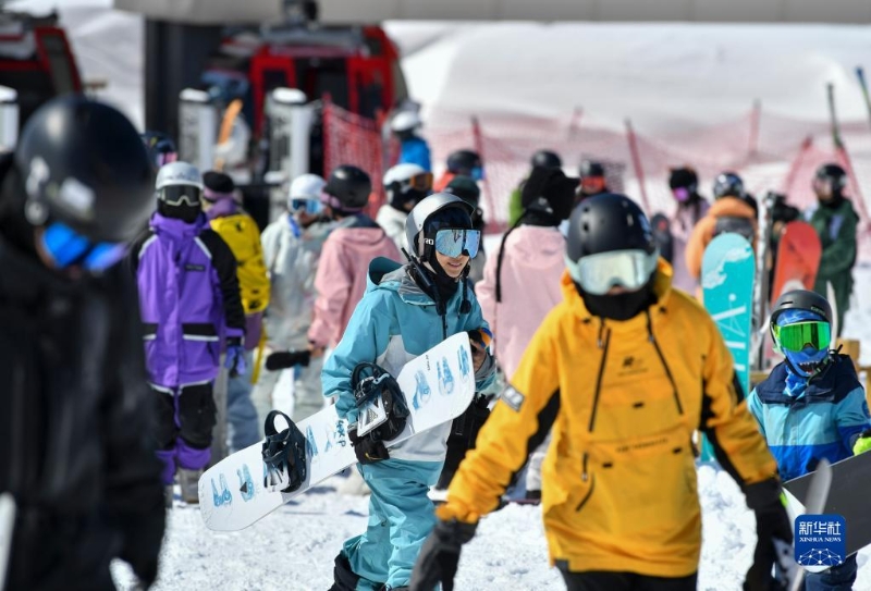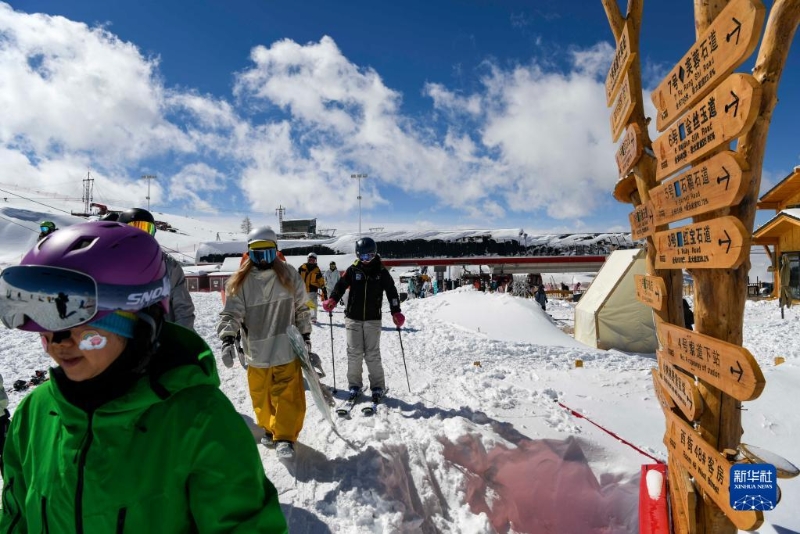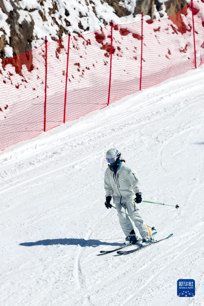 游客在新疆富蘊縣可可托海國際滑雪度假區(qū)滑雪游玩(4月9日攝)。