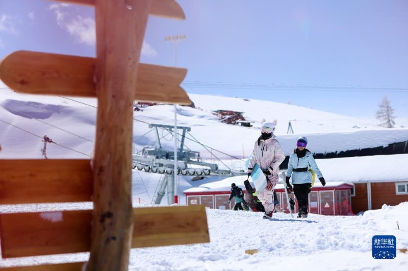 滑雪愛好者走在新疆富蘊縣可可托海國際滑雪度假區(qū)內(nèi)(4月9日攝)。