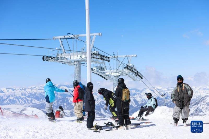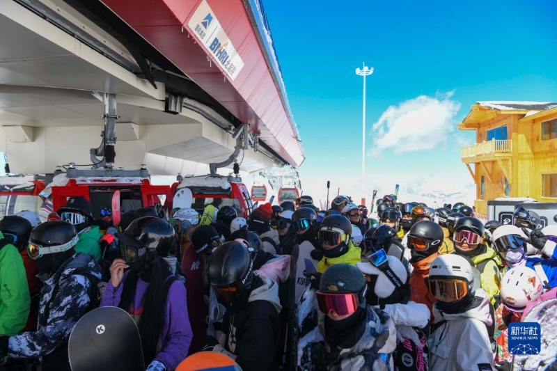 游客在新疆富蘊縣可可托海國際滑雪度假區(qū)排隊等候乘坐纜車(4月9日攝)。