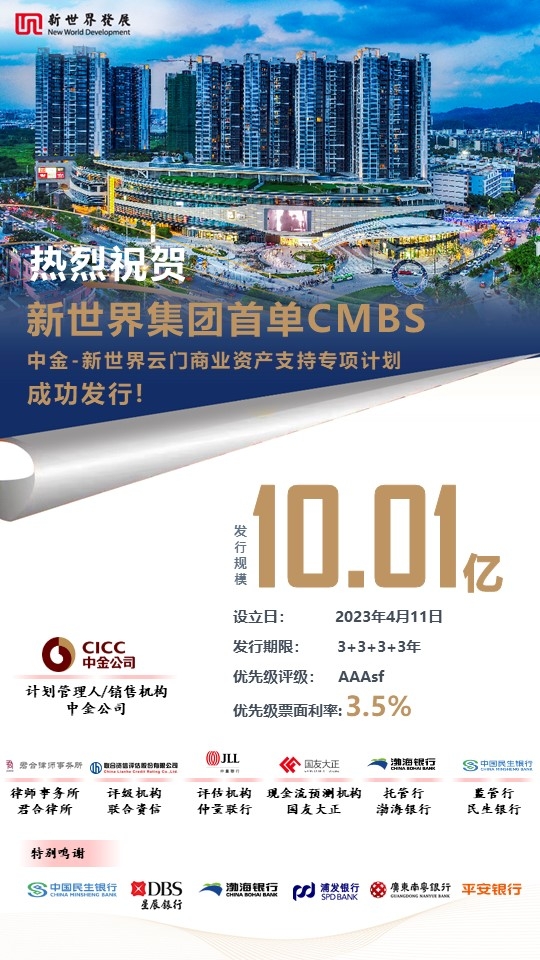 4月11日,新世界發(fā)展有限公司旗下的內(nèi)地物業(yè)旗艦新世界中國,成功在深圳證券交易所發(fā)行國內(nèi)首單商業(yè)房地產(chǎn)抵押貸款支持證券(以下簡稱“CMBS”)——“中金-新世界云門商業(yè)資產(chǎn)支持專項計劃”。該項目發(fā)行規(guī)模10.01億元,優(yōu)先級信用評級為AAAsf,發(fā)行票面利率3.5%,中國國際金融股份有限公司(以下簡稱“中金公司”)擔(dān)任計劃管理人。此次CMBS的成功發(fā)行,標(biāo)志著新世界邁出了資產(chǎn)證券化重要的一步,彰顯了金融機構(gòu)及投資者對目標(biāo)項目和集團綜合實力的高度信任和認可,也為信用資本市場注入信心與動力。