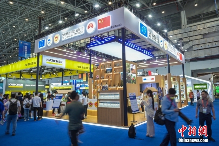 4月11日,第三屆中國國際消費品博覽會在海南省??谑姓介_展。中歐地理標志展示館攜數百種特色農產品和手工藝品亮相第三屆消博會現場。圖為中歐地理標志展示館。中新社記者 駱云飛 攝